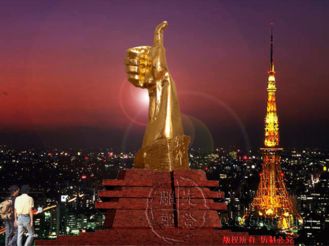 若要用一個詞來形容眼前的雕塑,莫過于“芝華士”了,沿用克里斯汀·拉科魯瓦對芝華士的評價“在我看來,有些名字,哪怕只是聽人提起或在書中偶遇,就會不自覺地將其與'聲名顯赫'聯(lián)系起來,因為這些名字本身就代表著一種品質(zhì)、一種權(quán)威或者一種奢華氣質(zhì)。對我而言,'芝華士'這三個字就是'時尚''奢華''尊貴'的代名詞。”一種酒何以用“奢侈”、“最貴”、“時尚”來形容?路人皆知,喝芝華士是一種享受,將酒提升為藝術(shù),由內(nèi)而外的品鑒,是一種邊緣文化潮流化,這一切不僅源于調(diào)酒師Colin Scott以及精湛絕倫的技術(shù),而且他擁有世界頂級設(shè)計師克里斯汀·拉科魯瓦、亞歷山大麥克奎恩。然而一尊雕塑,何以用一種酒來代稱?其實不然,芝華士的定義早已并非一樽酒而已,芝華士,享有世界蘇格蘭高級威士忌,他是外在與內(nèi)在的統(tǒng)一,誠如雕塑所塑造的舉起的大拇指,同等的是一種邊緣文化,她需要人們鑒賞品位,需要足夠的情趣與審美素質(zhì)。如同芝華士所代表的“時尚”“豪華”“尊貴”,雕塑依然具有最豪華的陣容,華麗端莊的金箔,剛毅的輪廓,以及人類機理特征所表現(xiàn)的自然之美,他是藝術(shù)家獨具匠心的杰作,是一樽東方的皇室威士忌,享有與芝華士同樣的尊榮。用它來界定雕塑,而且是眼前獨具匠心的雕塑,是源于其洗凈鉛華般的唯美設(shè)計風(fēng)格以及其醇和出眾的口感,如雕塑從內(nèi)而外,周身所散發(fā)出的氣質(zhì)。