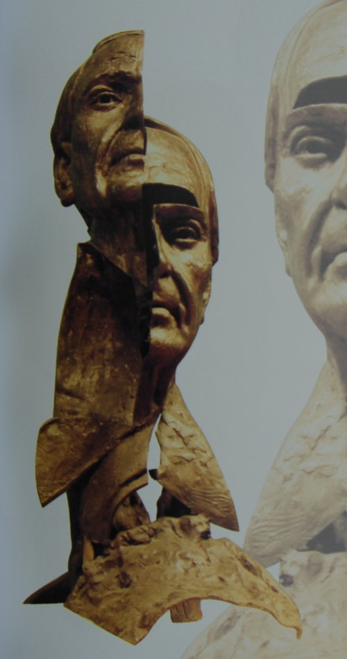 細看薛林納為名人制作的頭部塑像中,盡管各不相同,各有特色,但有一個共同的“薛林納語言”,那就是這樣名人的臉部大多從中央一劈為二,分成左右兩爿,愛因斯坦、畢加索、亨利·摩爾、曼德拉都有被分裂,被扭曲的形象。或許,薛林納想告訴大家,即使是偉人的人物,他們的性格也有兩面性;他們的左傾和右傾思想常常合二為一,卻又相對獨立;他們有成功光亮的一面,也有失敗困擾的一面。而這,才是完整的人生,才是他們真正的面貌。